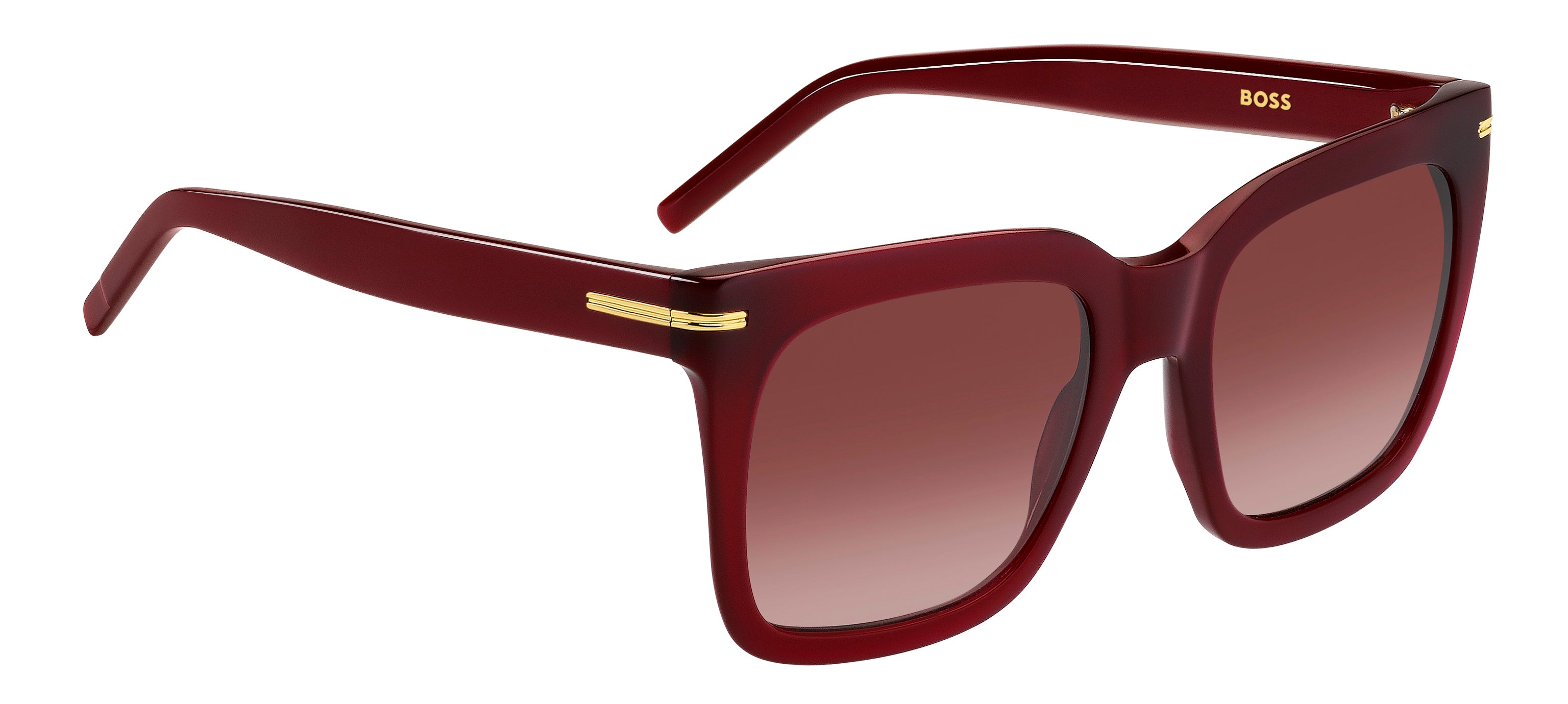 These women's eyeglasses by BOSS bring character to any outfit, including formal ensembles. Fashionistas of today and tomorrow will love their bold proportions, multifaceted surfaces, and undeniably sophisticated colour palettes. The metal detail that wraps from the front to the temple is shaped into the three stripes that symbolise BOSS, adding a distinct note that honours the brand. The eco-acetate structure can hold prescription sun lenses.